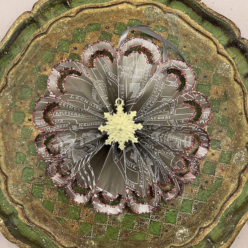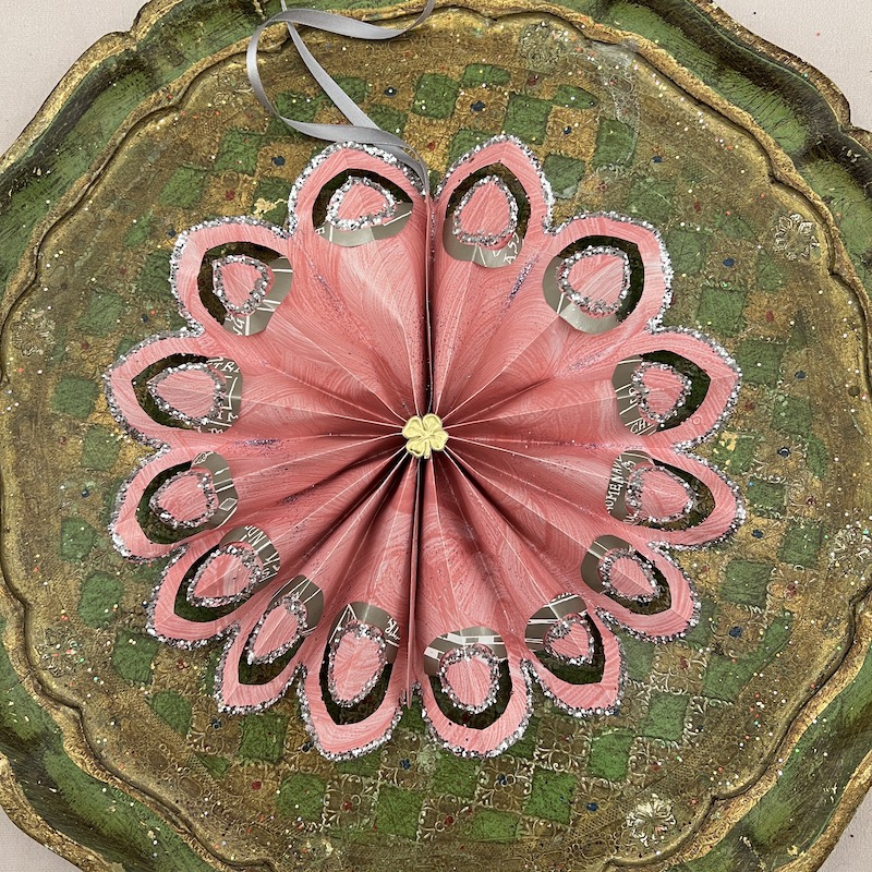 Sølvfarvet papir med skrift samt glimmer og dresden pap center - Bagsiden er malet rosa og dekoreret med sølv glimmer.