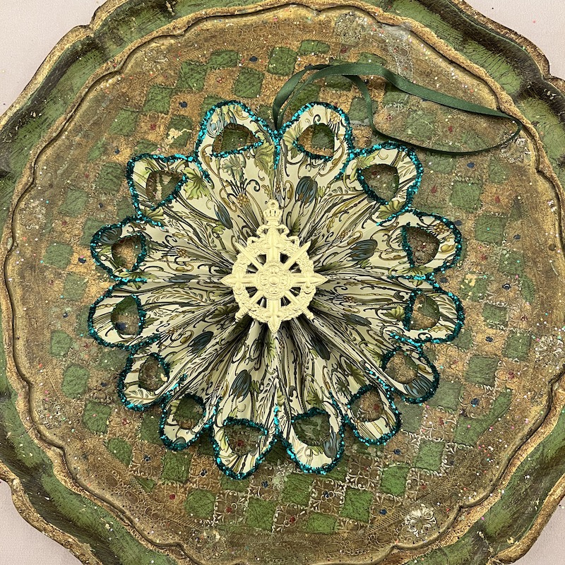 Flora mønster på beige baggrund med glimmer og dresden pap center - Bagsiden er håndmalet i matchende grøn og dekoreret med glimmer.