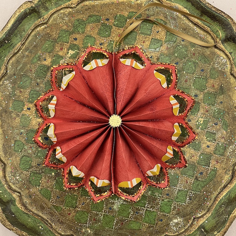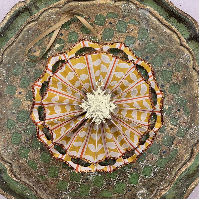 Grafisk mønster i gul, orange og offwhite med guld glimmer og dresden pap center - Bagsiden er håndmalet i smuk rød og dekoreret med glimmer.