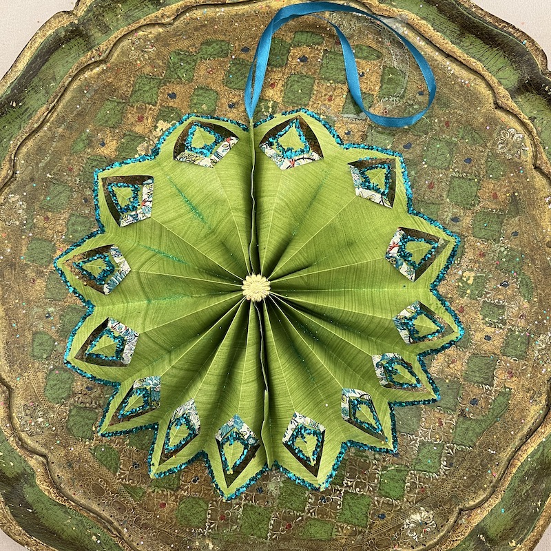 Italiensk mønster papir i turkis flora med glimmer og dresden pap center - Bagsiden er grøn og håndmalet samt dekoreret med glimmer.