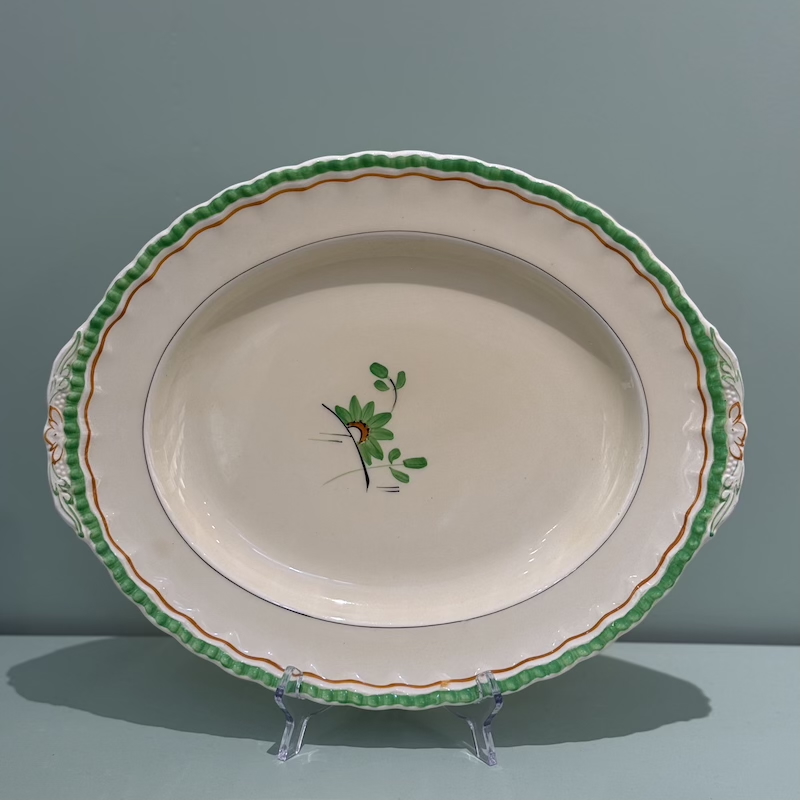 Smukke vintage fade fra Grindley, England i beige keramik dekoreret med klassisk blomstermotiv i varme nuancer. Fadene har en let oval form og en blød, blank glasur, som fremhæver det romantiske, håndmalede design. Perfekte til servering af kager, frugt eller som dekorative fade i køkken og spisestue. Fås i tre størrelser og kan kombineres som et elegant sæt.