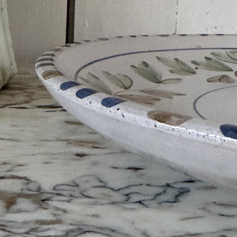 Smukt og charmerende fad, der vil være flot på en væg - Måske sammen med en masse andre platter. De tre pletter i midten er fra brændingen og der er ingen afslag på fadet. Ønskes den ophængt kan det købes hos en isenkræmmer.