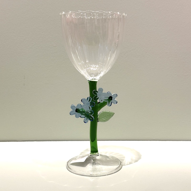 Håndlavet italiensk vinglas med lyseblå blomst.