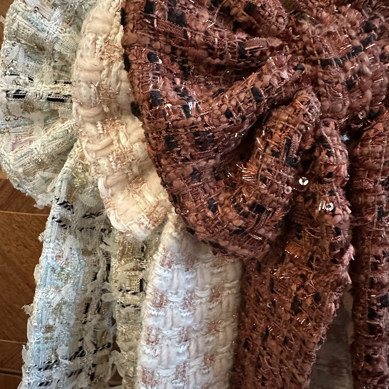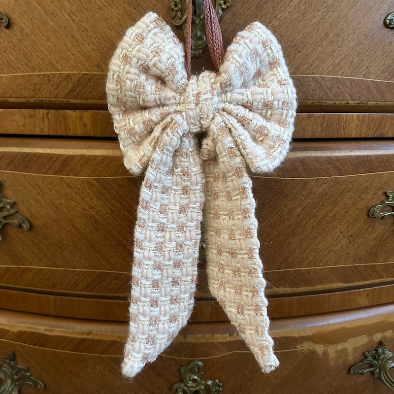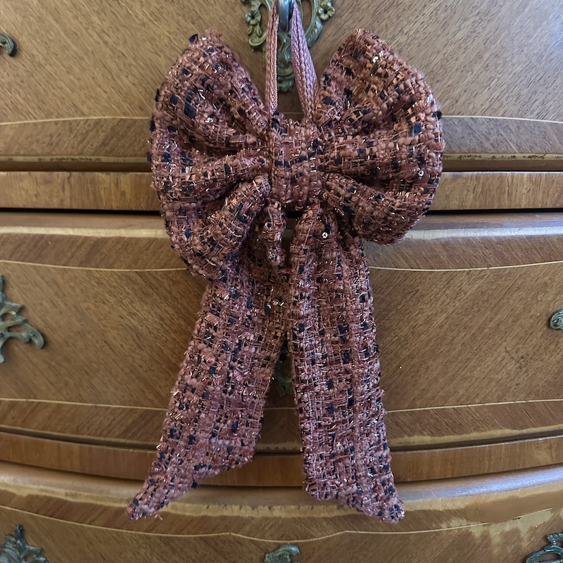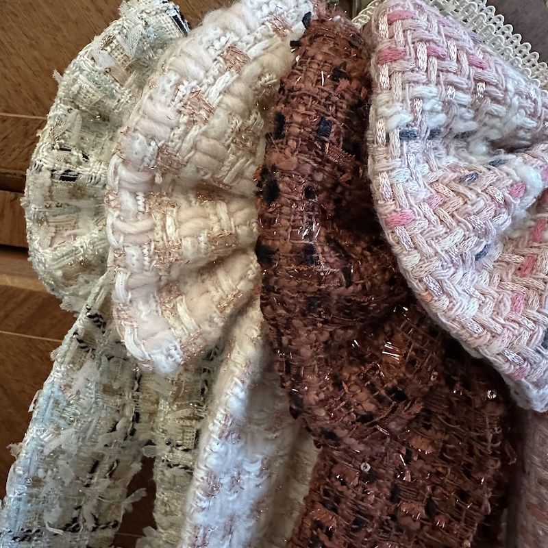 De skønneste sløjfer i eksklusivt Chanel tekstil - Håndlavet på eget værksted i Helsingør. Sløjferne er lavet i klassisk boucle tekstil og er puffede uden brug af fyld og de fine bånd er vintage. Virkelig fine på et møbel, en væg eller som pynt, hvor det nu passer ind i din indretning.