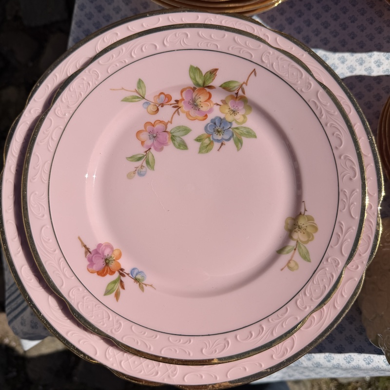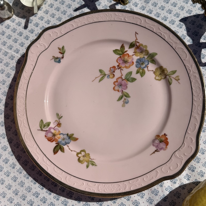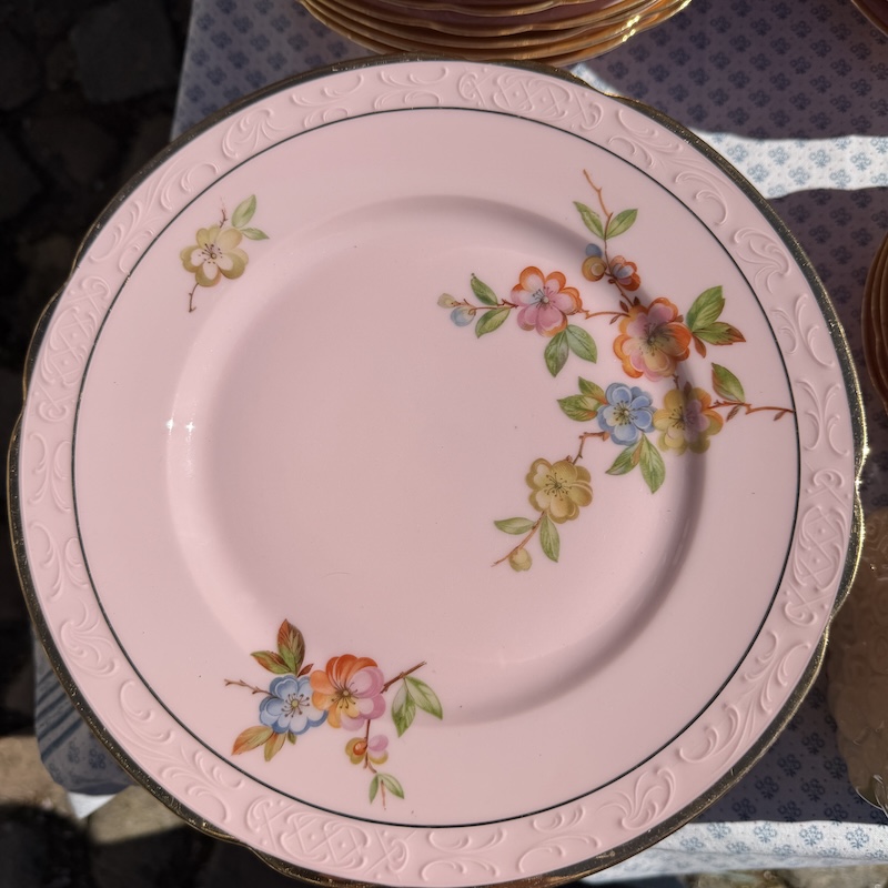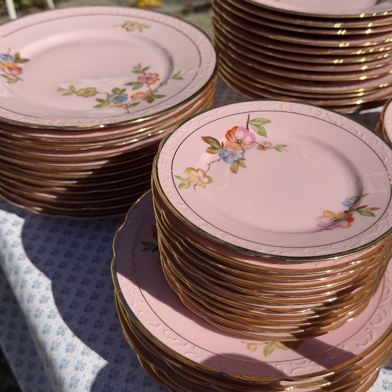 Det mest yndige stel vi længe har set - Meget lidt brugt og med fin guldkant. Stellet er ret sjældent i den farve. Malet på Københavns Porcelains Maleri og bundfarven er klar lyserød. En variant af det klassiske Rosenborg stel.