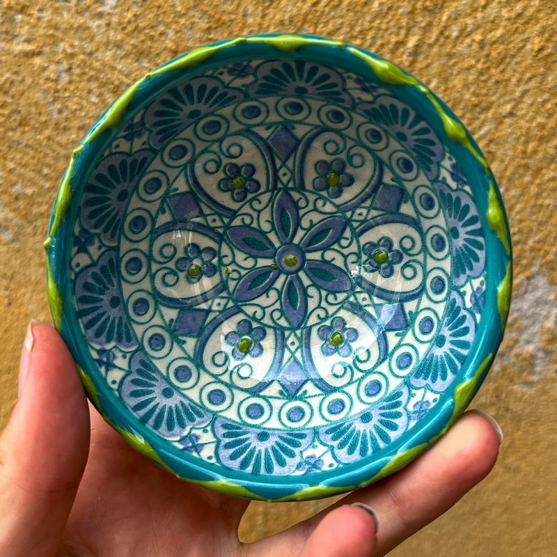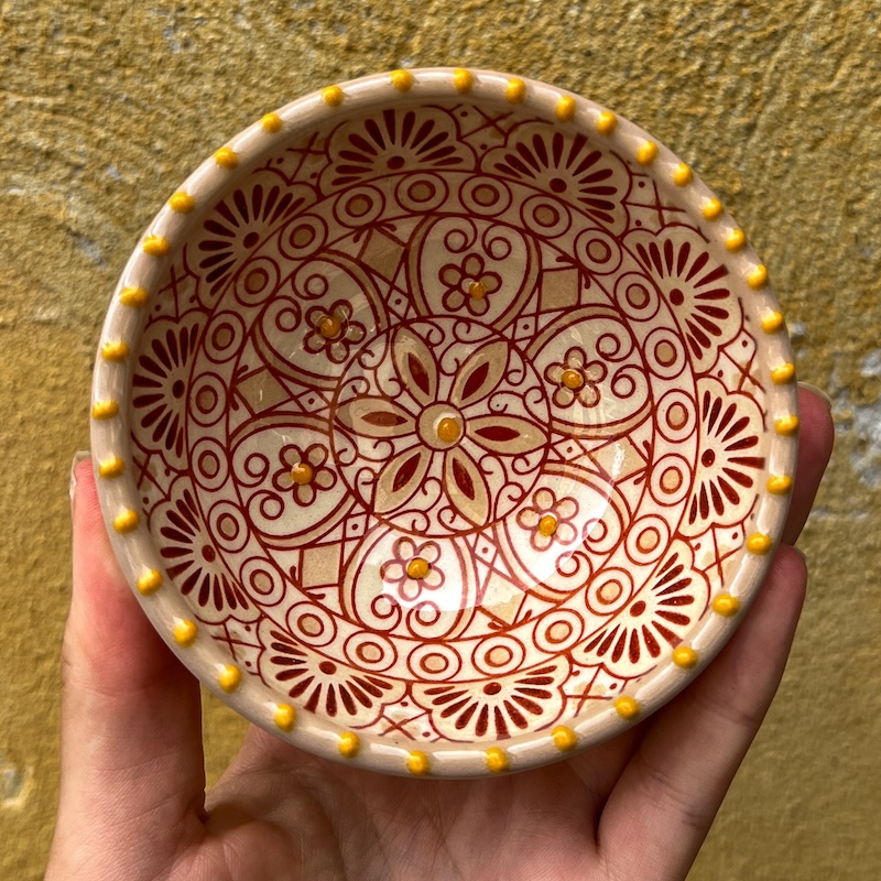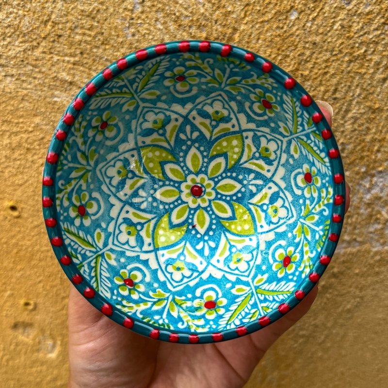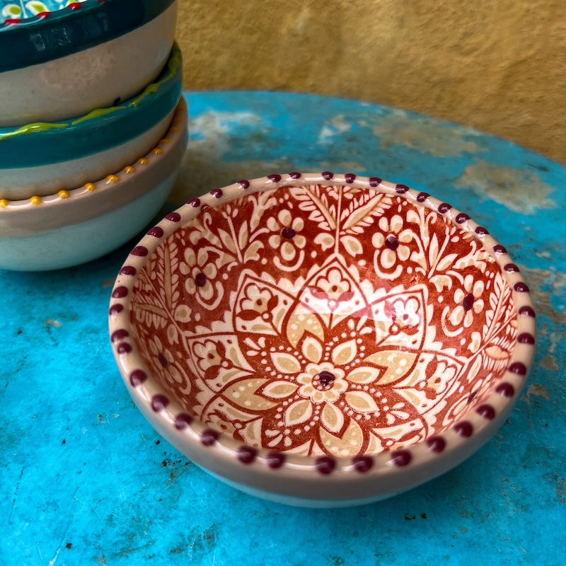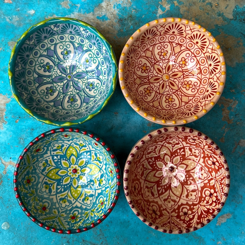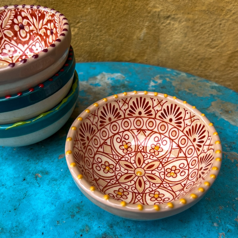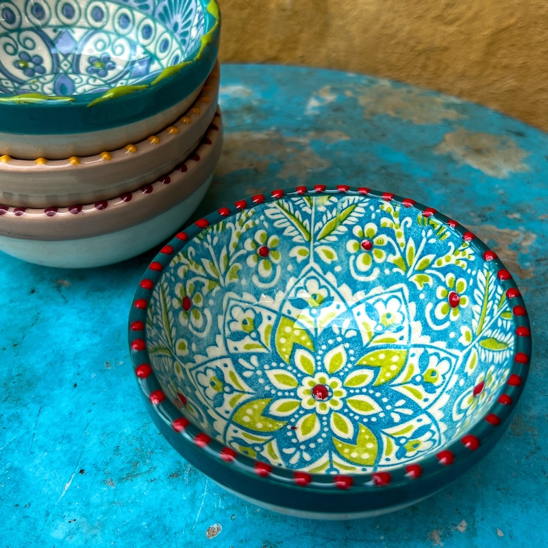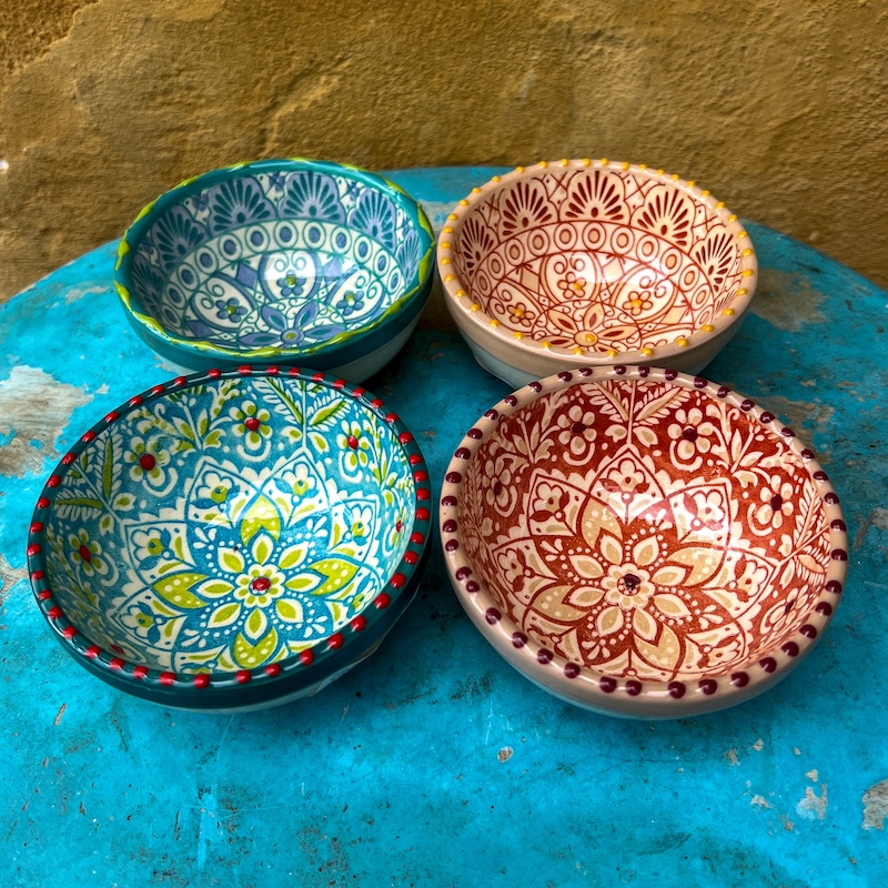 Farverige og håndmalede tapasskåle med dekorative mønstre og perlekant. Perfekte til små serveringer som oliven, nødder eller dips. De fire varianter – turkis med grøn, turkis med rød, beige med rød og beige med gul – gør det nemt at mikse og matche på bordet. Skålene er håndlavede og unikke, hvilket giver din servering personlighed og charme.