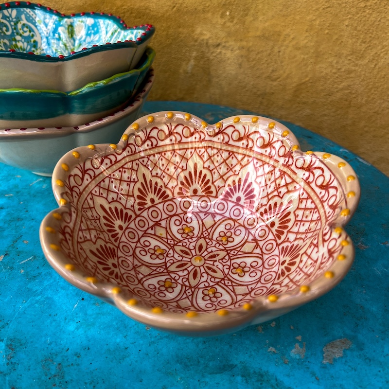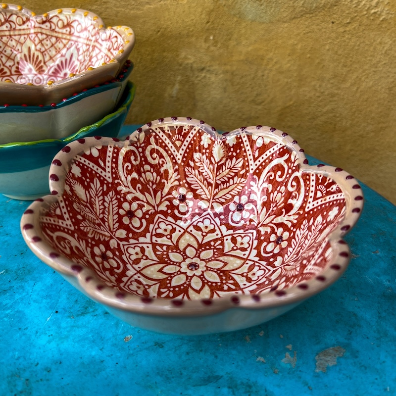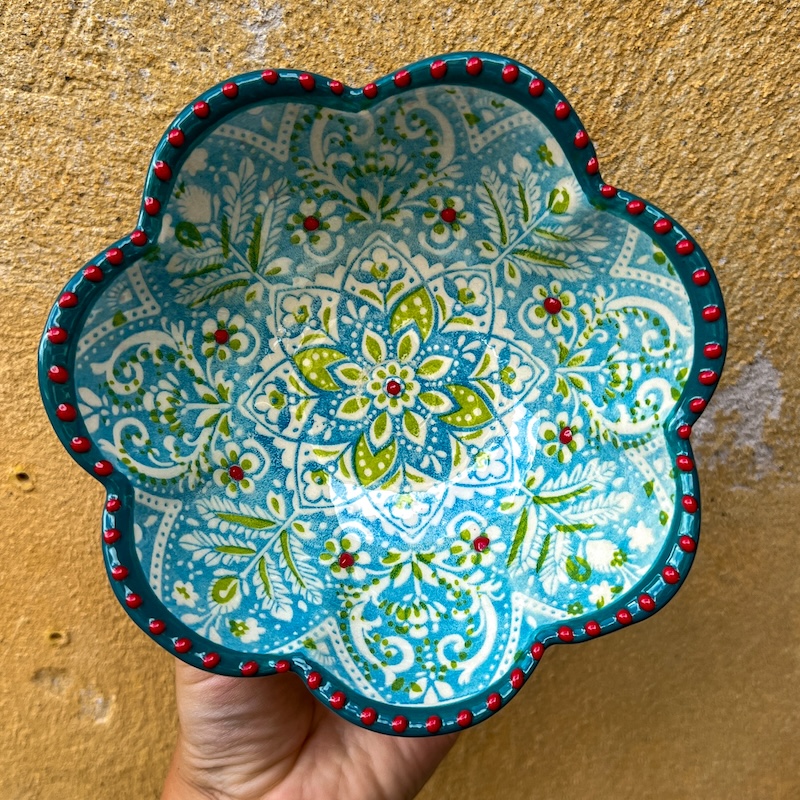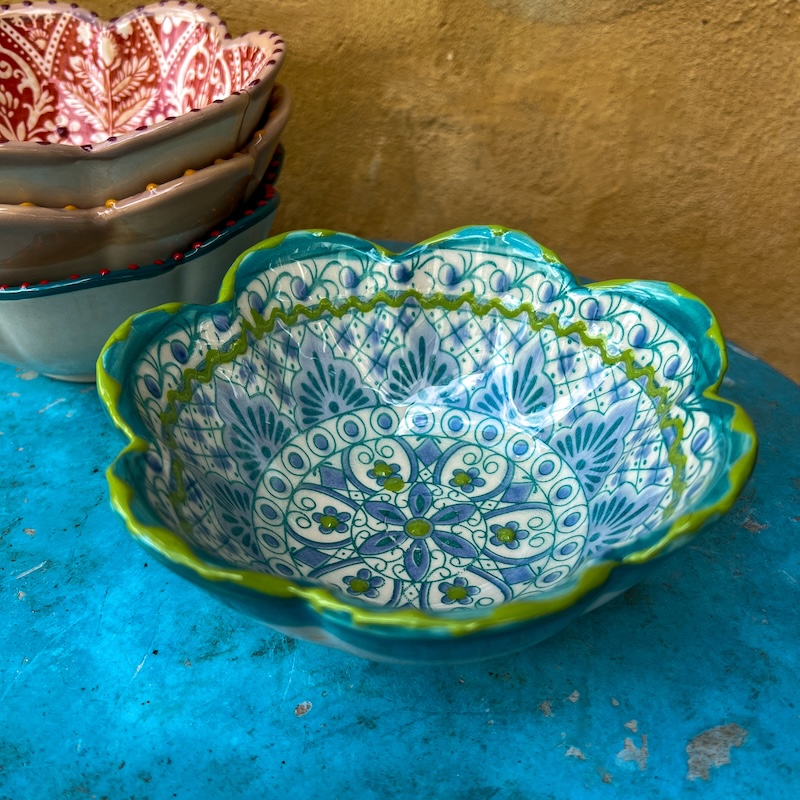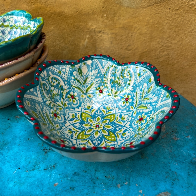 Smuk, håndmalet skål med dekorativ bølget kant og farverigt mønster. Perfekt til snacks, tilbehør eller småretter. Skålen fås i fire farvevarianter: turkis med grøn, turkis med rød, beige med gul og beige med rød. Hver skål er unik og bringer charme til borddækningen – både til hverdag og fest.