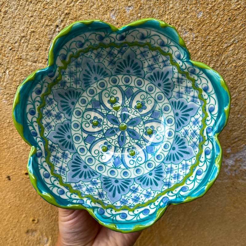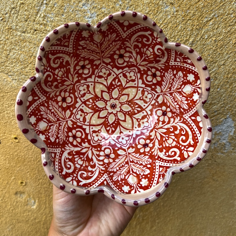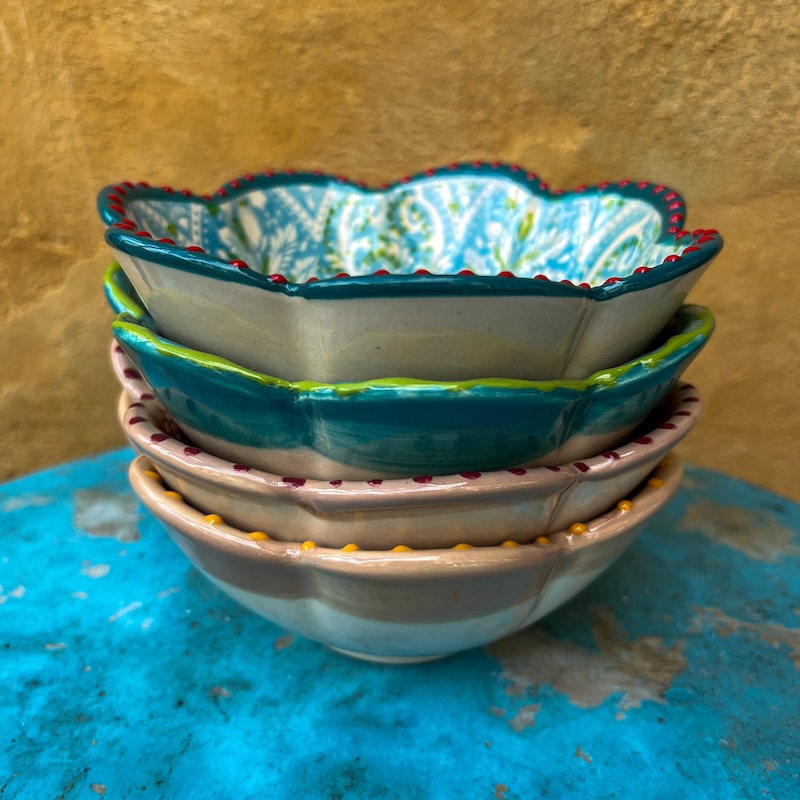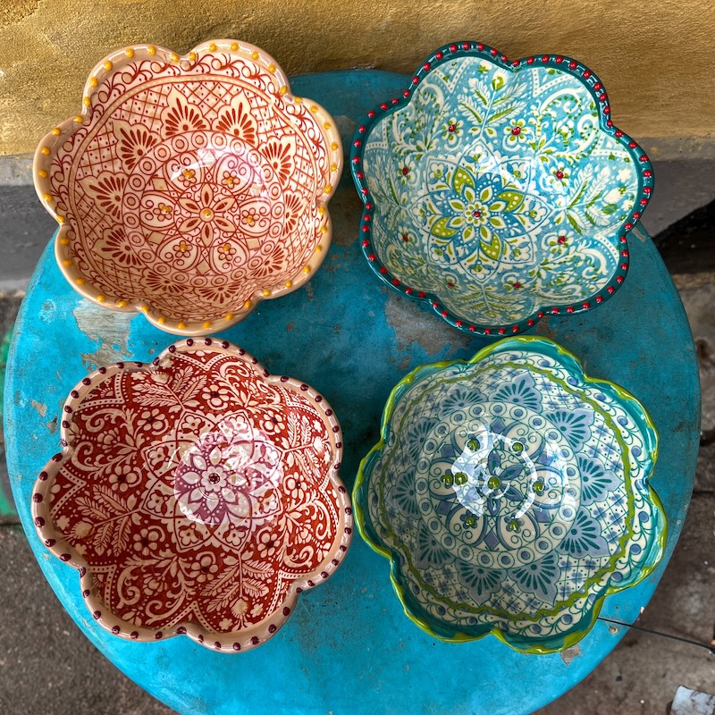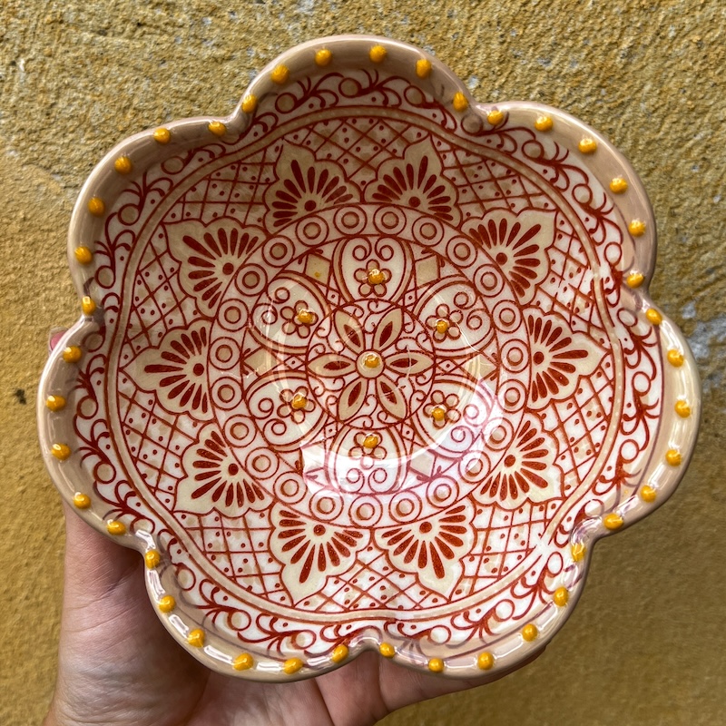 Smuk, håndmalet skål med dekorativ bølget kant og farverigt mønster. Perfekt til snacks, tilbehør eller småretter. Skålen fås i fire farvevarianter: turkis med grøn, turkis med rød, beige med gul og beige med rød. Hver skål er unik og bringer charme til borddækningen – både til hverdag og fest.