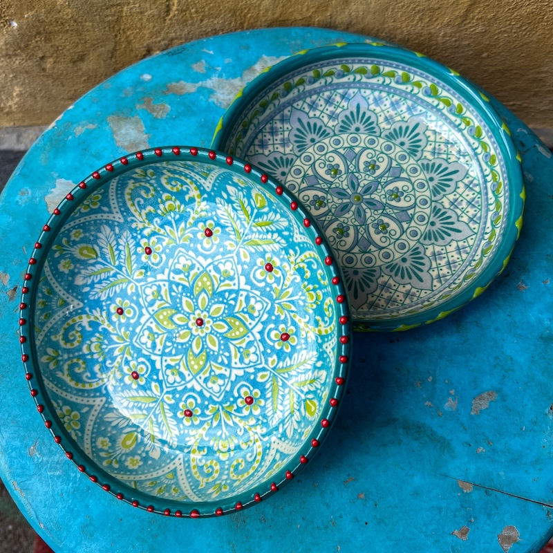 Aris low bowl er en rummelig og lav skål i smukt håndmalet keramik. Perfekt som serveringsskål til salater, pasta eller frugt – og dekorativ nok til at stå fremme. Skålen fås i fire varianter: turkis med grøn, turkis med rød, beige med gul og beige med rød. Hver skål er håndlavet og unik.