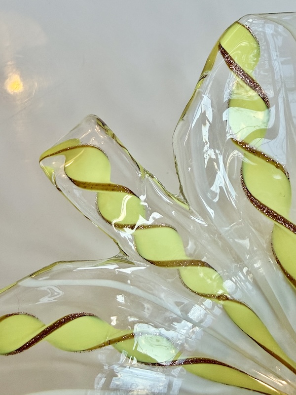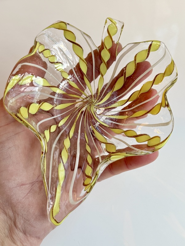 Vor tids mest elskede vintage glas - Muranos gamle glas teknik er elsket over hele verden - Denne smukke skål i gul og guld på klar glas er helt vidunderlig - Perfekt stand, som var den lige komme fra glasværket. Brug den blot til pynt eller server diverse snack på sofabordet. Virkelig fin.