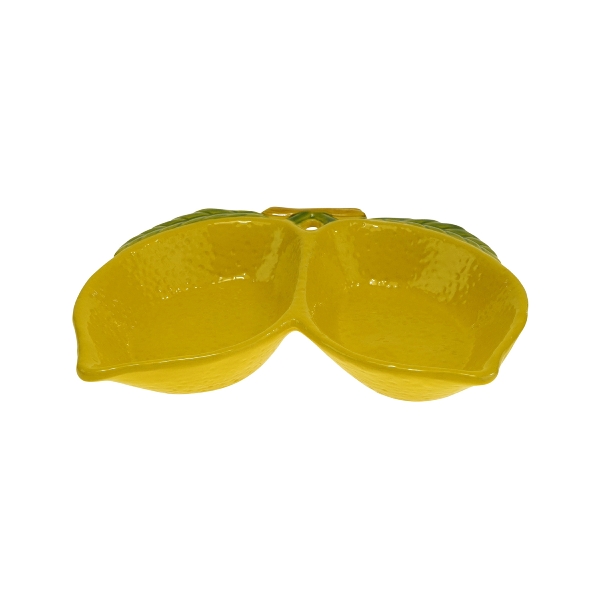 Denne dekorative dobbeltskål formet som to citronbåde tilfører et friskt og sommerligt udtryk til bordet. Den klare gule glasur og de fine detaljer med blad og stilk giver skålen et legende og iøjnefaldende design, der straks skaber stemning.