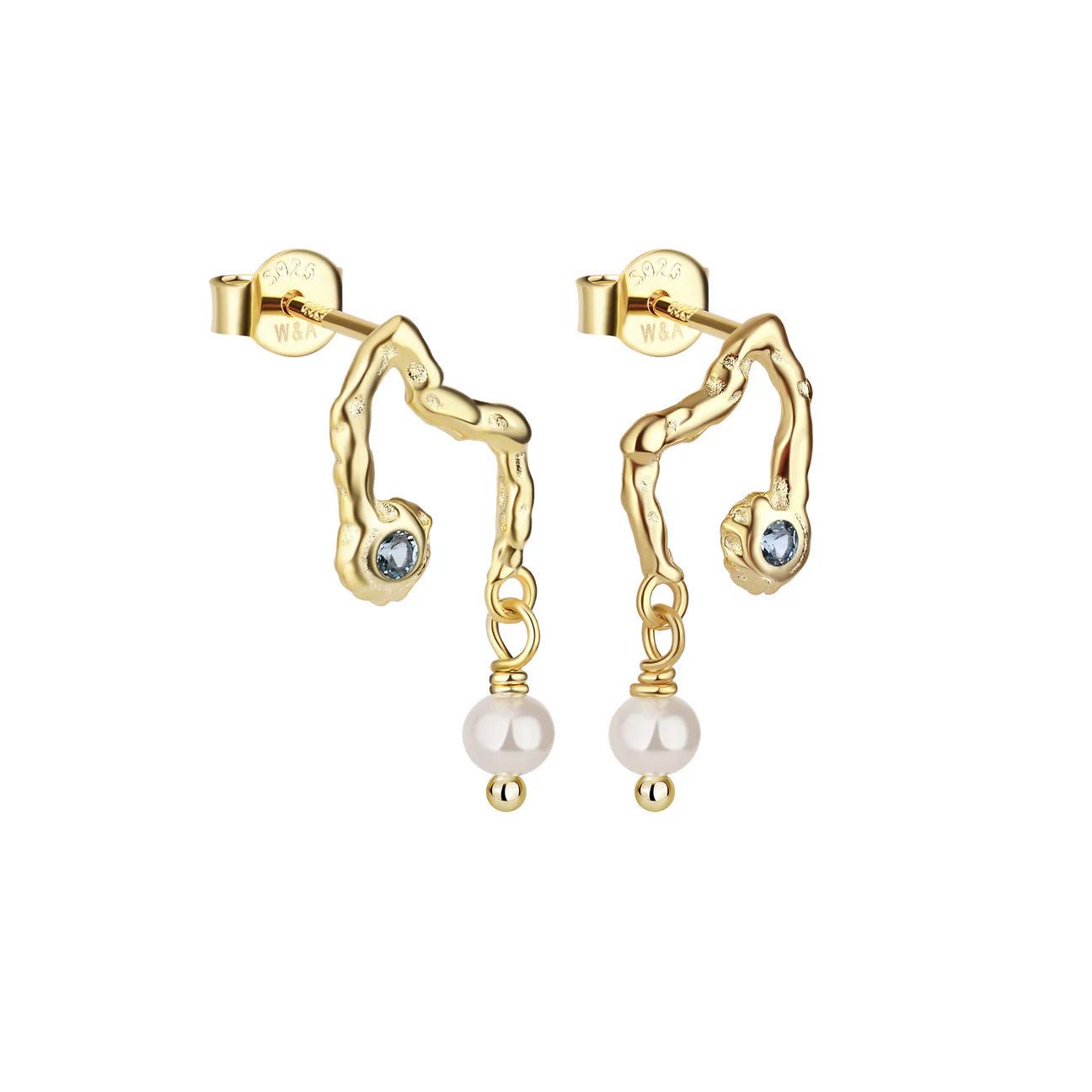Alvig øreringene forener det rå og det raffinerede i ét design. Den organiske form i gyldent sølv er prydet med en smuk blå zirkoniasten og afsluttes med en fin lille ferskvandsperle. Et unikt par øreringe, der både kan stå alene eller mixes med andre styles for et personligt look.