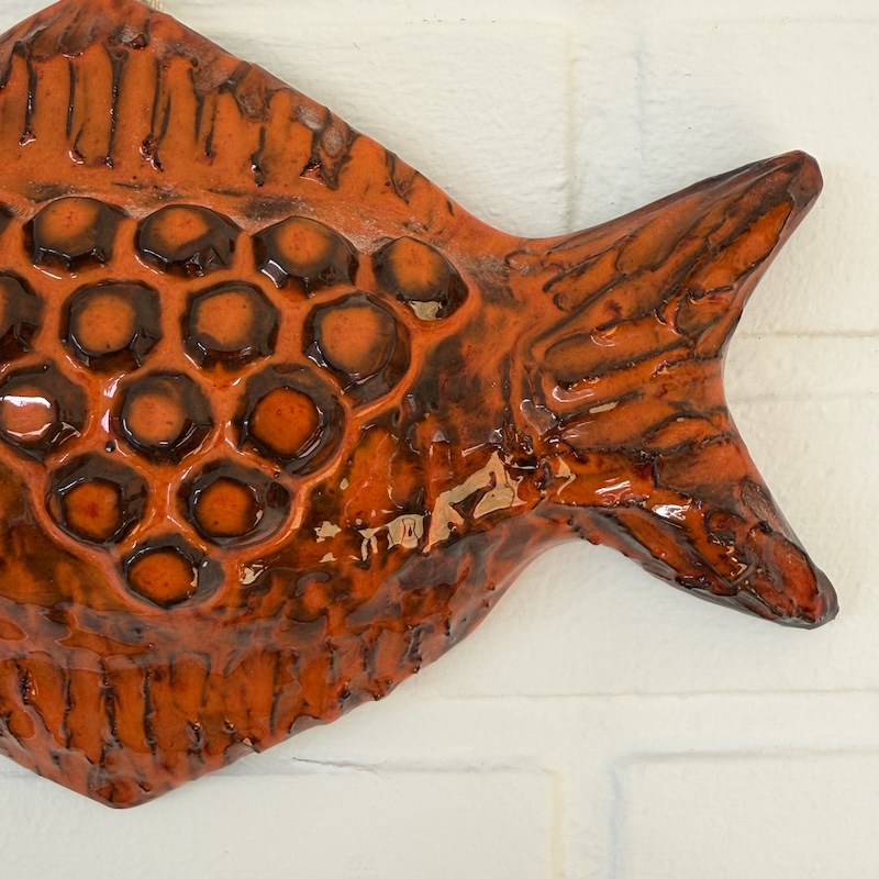 Signeret relief, orange fisk. Relieffen er stemplet og signeret. Snor på bagsiden for let ophæng på søm eller lign.
