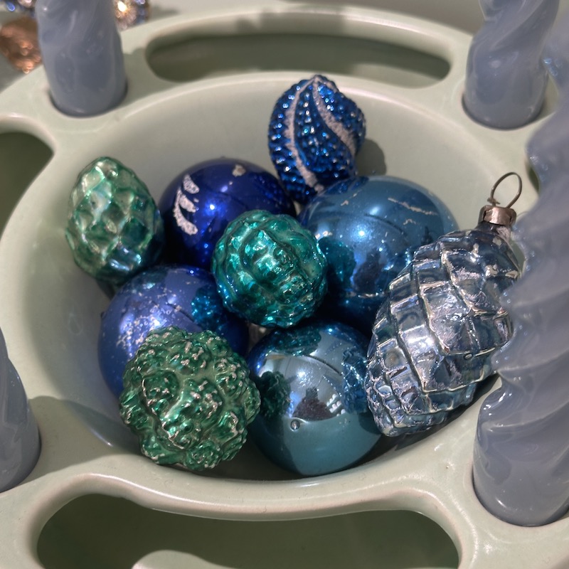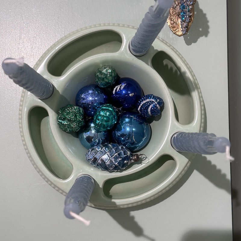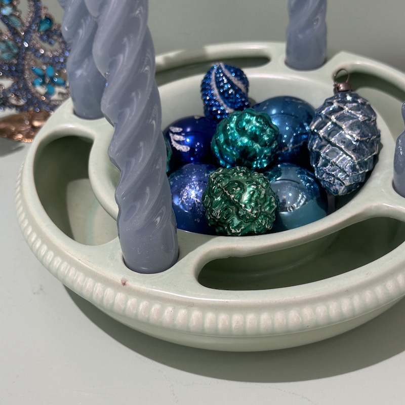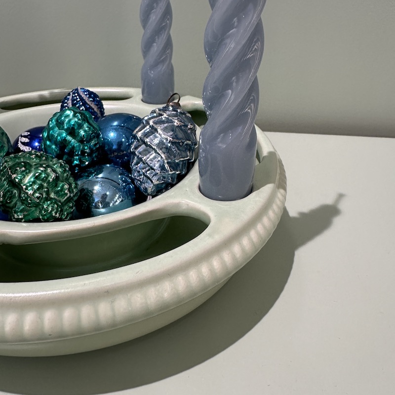 Dekorativ adventsstage i keramik - Der er plads til at pynte med grønt og der kan fyldes vand i siderne, så det ikke visner - I midten kan der fyldes nødder eller andet dekorativ. Beregnet til alm kronelys. Stagen er tysk og angiveligt fra 50érne.