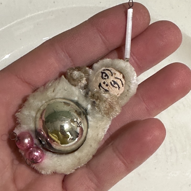 Antik Gablonz julepynt bestående af små mundblæste glasdele og chenille materialer - Stilen er helt klassisk for Gablonz pynt - L9 cm