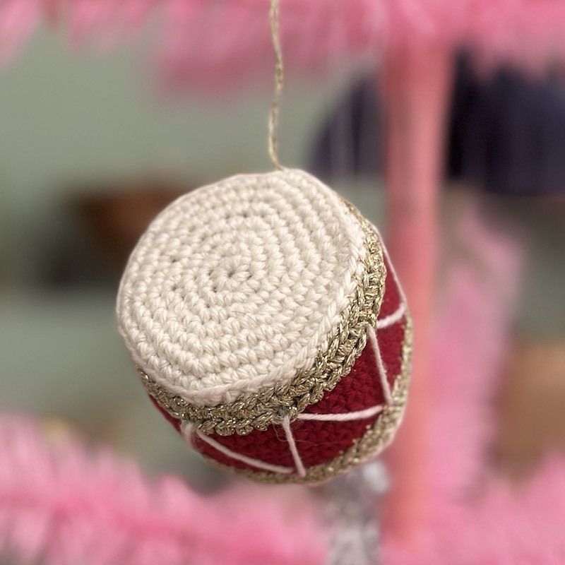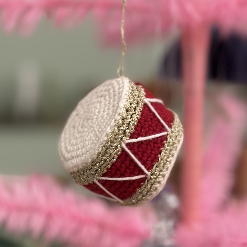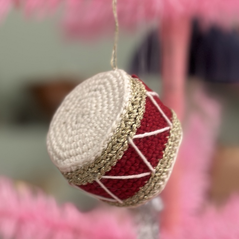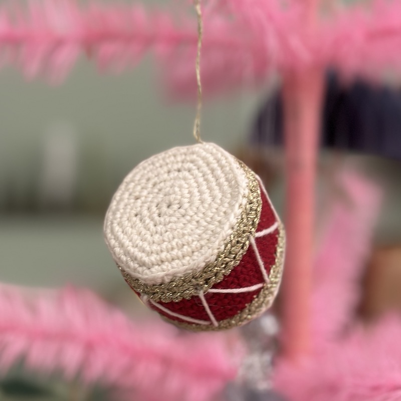De fineste trommer, hånd hæklet, det bedste håndværk. Helt klassisk julepynt og her hæklet sirligt i hånden - Trommen hænger i en fin tynd guldsnor. Trommerne er hæklet i Danmark.