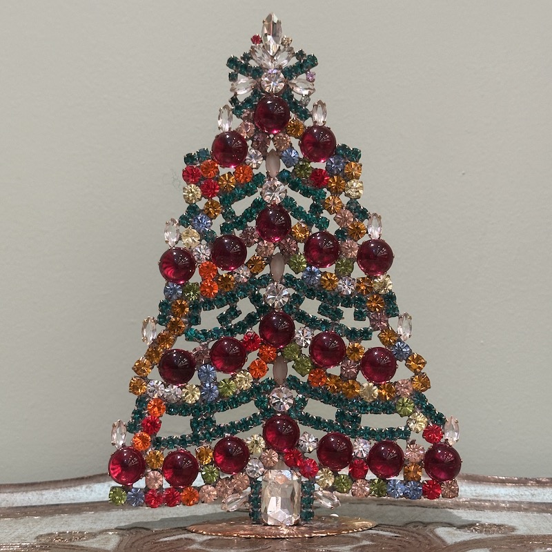 Vi har gennem alle årene haft de fine rhinstens juletræer fra Tjekkiet, hvor de i dag samles i hånden og er et fint stykke kunsthåndværk - Rhinstenene er fra før 2. verdenskrig og er fra de gamle smykkeværksteder, der blev forladt i efterkrigstiden. Derefter stod de urørte i mange år indtil man begyndte at købe de gamle sten op slut 80érne og begyndte af skabe de smukke træer, hvor foden er bagpladen af en broche. I dag sælges de smukke træer mange steder i verden og er efterhånden blevet et samlerobjekt, da mange af træerne er unika. Flere af vores kunder har efterhånden en hel rhinstens skov af juletræer, der findes frem år efter år og hvert år vælges et nyt til samlingen