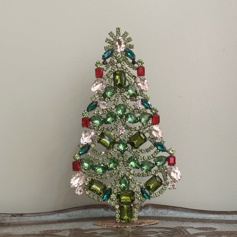 Vi har gennem alle årene haft de fine rhinstens juletræer fra Tjekkiet, hvor de i dag samles i hånden og er et fint stykke kunsthåndværk - Rhinstenene er fra før 2. verdenskrig og er fra de gamle smykkeværksteder, der blev forladt i efterkrigstiden. Derefter stod de urørte i mange år indtil man begyndte at købe de gamle sten op slut 80érne og begyndte af skabe de smukke træer, hvor foden er bagpladen af en broche. I dag sælges de smukke træer mange steder i verden og er efterhånden blevet et samlerobjekt, da mange af træerne er unika. Flere af vores kunder har efterhånden en hel rhinstens skov af juletræer, der findes frem år efter år og hvert år vælges et nyt til samlingen