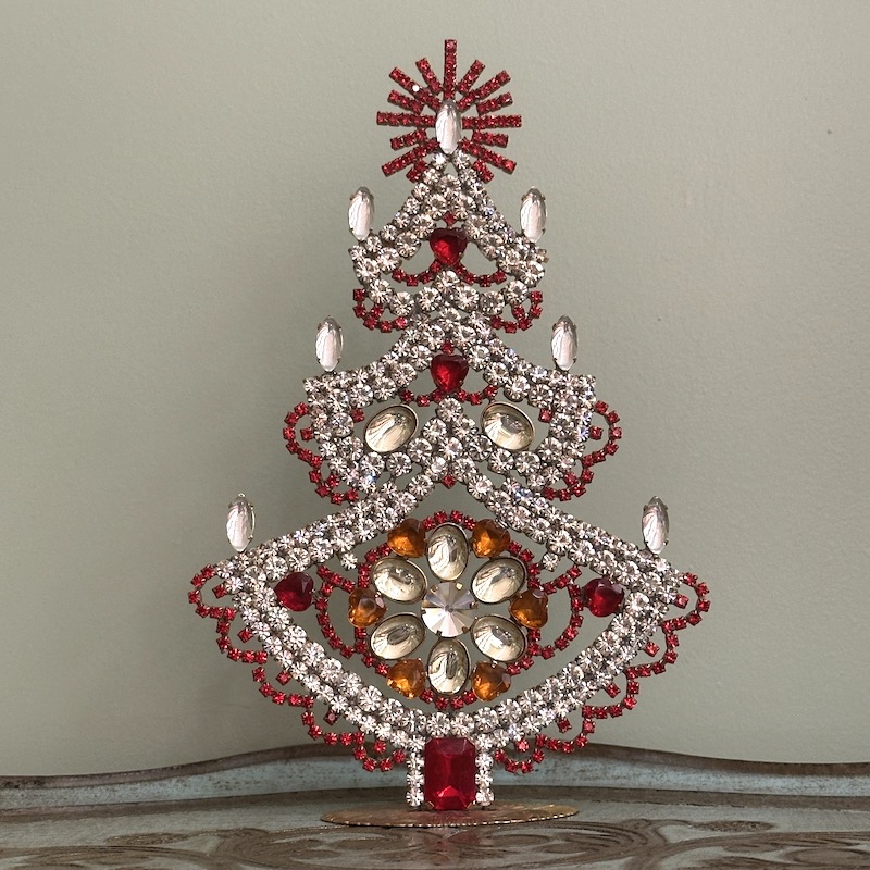 Vi har gennem alle årene haft de fine rhinstens juletræer fra Tjekkiet, hvor de i dag samles i hånden og er et fint stykke kunsthåndværk - Rhinstenene er fra før 2. verdenskrig og er fra de gamle smykkeværksteder, der blev forladt i efterkrigstiden. Derefter stod de urørte i mange år indtil man begyndte at købe de gamle sten op slut 80érne og begyndte af skabe de smukke træer, hvor foden er bagpladen af en broche. I dag sælges de smukke træer mange steder i verden og er efterhånden blevet et samlerobjekt, da mange af træerne er unika. Flere af vores kunder har efterhånden en hel rhinstens skov af juletræer, der findes frem år efter år og hvert år vælges et nyt til samlingen