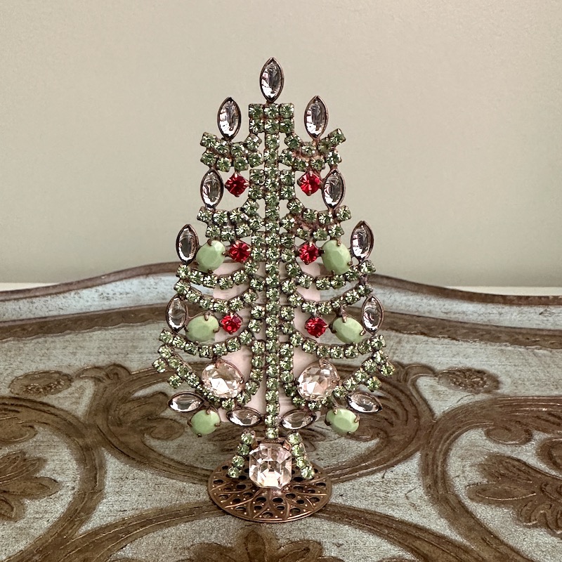 Vi har gennem alle årene haft de fine rhinstens juletræer fra Tjekkiet, hvor de i dag samles i hånden og er et fint stykke kunsthåndværk - Rhinstenene er fra før 2. verdenskrig og er fra de gamle smykkeværksteder, der blev forladt i efterkrigstiden. Derefter stod de urørte i mange år indtil man begyndte at købe de gamle sten op slut 80érne og begyndte af skabe de smukke træer, hvor foden er bagpladen af en broche. I dag sælges de smukke træer mange steder i verden og er efterhånden blevet et samlerobjekt, da mange af træerne er unika. Flere af vores kunder har efterhånden en hel rhinstens skov af juletræer, der findes frem år efter år og hvert år vælges et nyt til samlingen