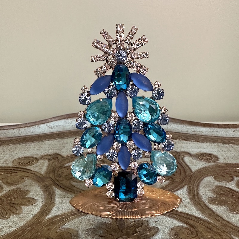 Vi har gennem alle årene haft de fine rhinstens juletræer fra Tjekkiet, hvor de i dag samles i hånden og er et fint stykke kunsthåndværk - Rhinstenene er fra før 2. verdenskrig og er fra de gamle smykkeværksteder, der blev forladt i efterkrigstiden. Derefter stod de urørte i mange år indtil man begyndte at købe de gamle sten op slut 80érne og begyndte af skabe de smukke træer, hvor foden er bagpladen af en broche. I dag sælges de smukke træer mange steder i verden og er efterhånden blevet et samlerobjekt, da mange af træerne er unika. Flere af vores kunder har efterhånden en hel rhinstens skov af juletræer, der findes frem år efter år og hvert år vælges et nyt til samlingen