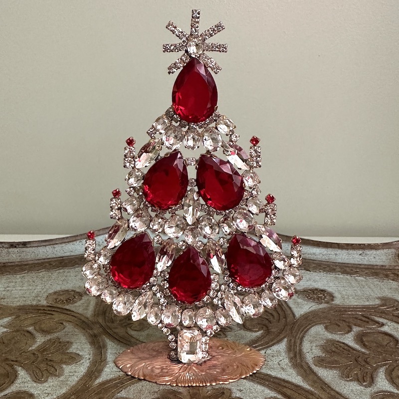 Vi har gennem alle årene haft de fine rhinstens juletræer fra Tjekkiet, hvor de i dag samles i hånden og er et fint stykke kunsthåndværk - Rhinstenene er fra før 2. verdenskrig og er fra de gamle smykkeværksteder, der blev forladt i efterkrigstiden. Derefter stod de urørte i mange år indtil man begyndte at købe de gamle sten op slut 80érne og begyndte af skabe de smukke træer, hvor foden er bagpladen af en broche. I dag sælges de smukke træer mange steder i verden og er efterhånden blevet et samlerobjekt, da mange af træerne er unika. Flere af vores kunder har efterhånden en hel rhinstens skov af juletræer, der findes frem år efter år og hvert år vælges et nyt til samlingen