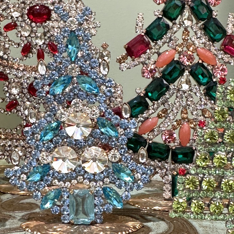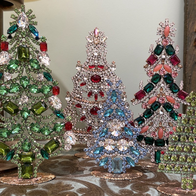 Vi har gennem alle årene haft de fine rhinstens juletræer fra Tjekkiet, hvor de i dag samles i hånden og er et fint stykke kunsthåndværk - Rhinstenene er fra før 2. verdenskrig og er fra de gamle smykkeværksteder, der blev forladt i efterkrigstiden. Derefter stod de urørte i mange år indtil man begyndte at købe de gamle sten op slut 80érne og begyndte af skabe de smukke træer, hvor foden er bagpladen af en broche. I dag sælges de smukke træer mange steder i verden og er efterhånden blevet et samlerobjekt, da mange af træerne er unika. Flere af vores kunder har efterhånden en hel rhinstens skov af juletræer, der findes frem år efter år og hvert år vælges et nyt til samlingen
