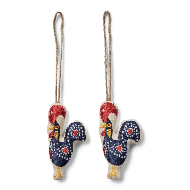 Sætte indeholder 2 haner, som kommer i en fin broderet stofpose, så de kan opbevares sikkert fra år til år.