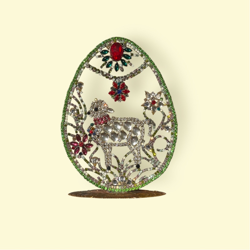 Påskeæg og -pynt har altid været en del af vores påsketradition og vi finder dem i haven, bruger dem til pynt og spiser dem fyldt med lækkert marcipan eller andre gode ting. Her et fint æg, håndlavet i Tjekkiet efter de gamle metoder og med gamle Rhinsten.