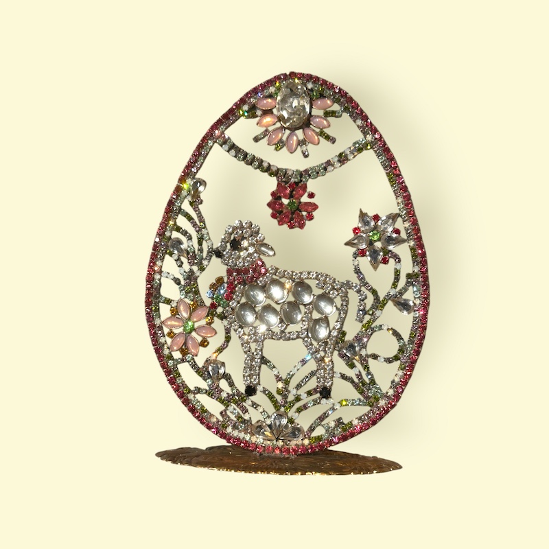 Påskeæg og -pynt har altid været en del af vores påsketradition og vi finder dem i haven, bruger dem til pynt og spiser dem fyldt med lækkert marcipan eller andre gode ting. Her et fint æg, håndlavet i Tjekkiet efter de gamle metoder og med gamle Rhinsten.