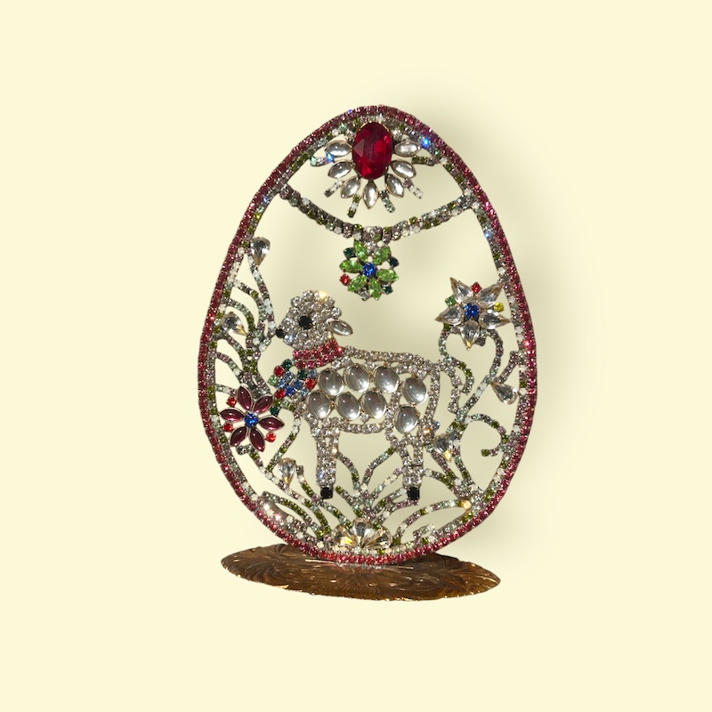 Påskeæg og -pynt har altid været en del af vores påsketradition og vi finder dem i haven, bruger dem til pynt og spiser dem fyldt med lækkert marcipan eller andre gode ting. Her et fint æg, håndlavet i Tjekkiet efter de gamle metoder og med gamle Rhinsten.