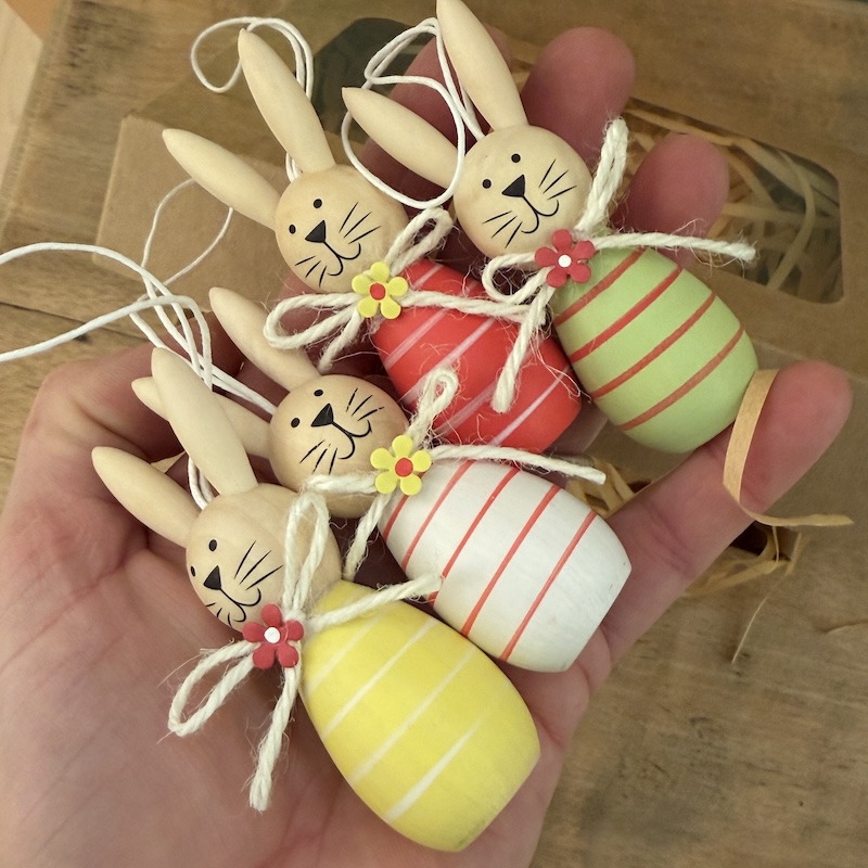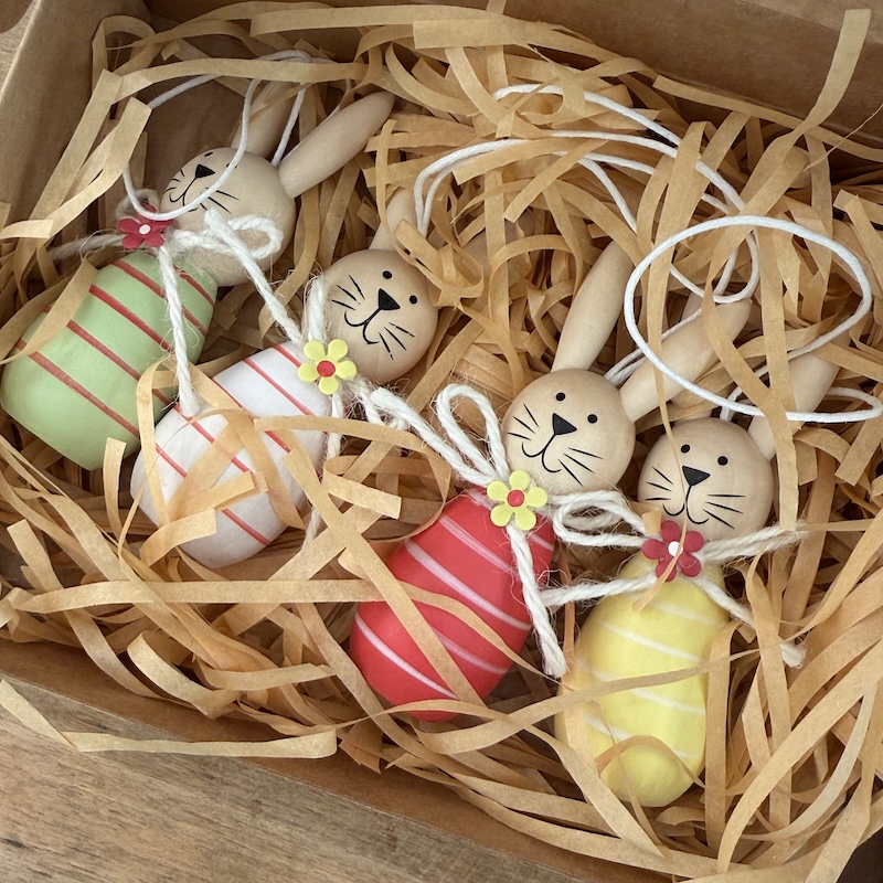Kaniner så fine eller er det mon påskeharer? Gul, grøn, rød og gul - De har snor og er klar til at hænge på en gren.