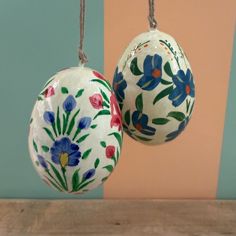 Håndmalede påskeæg i papmache i 2 varianter.