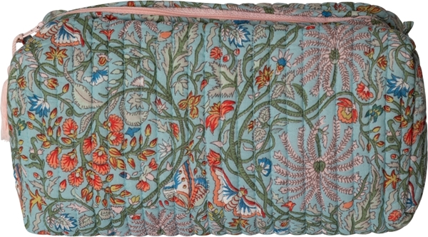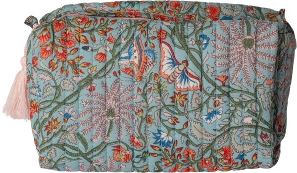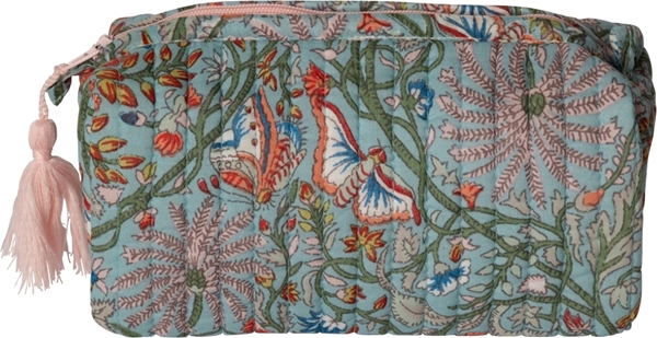 Quiltet kosmetiktaske i bomuld med smukt mønster i lyseblå og pink toner. Tasken har lynlås og små indvendige lommer, og findes i tre praktiske størrelser. Perfekt til rejser, makeup eller opbevaring af småting i hverdagen.
