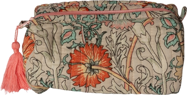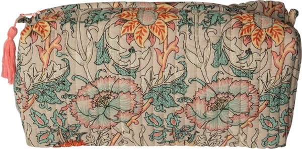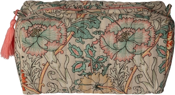 Quiltet kosmetiktaske i bomuld med smukt mønster i støvet turkis og gul. Tasken har lynlås og små indvendige lommer, og findes i tre praktiske størrelser. Perfekt til rejser, makeup eller opbevaring af småting i hverdagen.