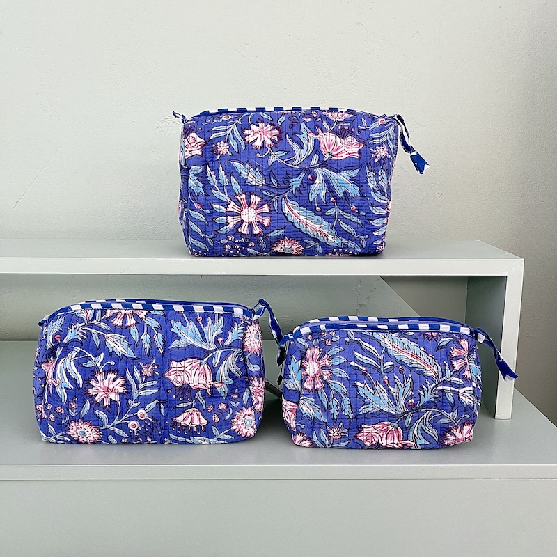 Smuk kosmetiktaske i et levende blå/rosa mønster med fine blomstermotiver. Tasken er quiltet for et blødt og eksklusivt udtryk, og hver model er i et traditionelt artisan-design, der giver et unikt og håndgjort look.