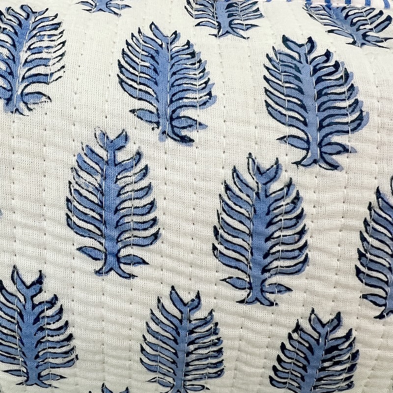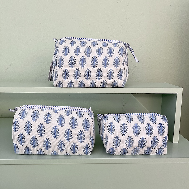 Smuk kosmetiktaske i et elegant creme/turkis mønster med fine botaniske motiver. Tasken er quiltet for et blødt og eksklusivt udtryk, og hvert stykke er syet i et traditionelt artisan-design, som gør hver taske en smule unik.