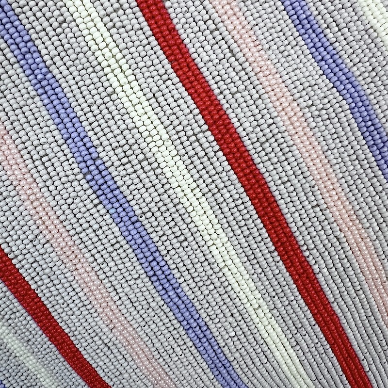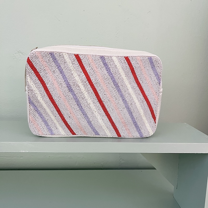 Eksklusiv kosmetiktaske fra Nynne Rosenvinge, lavet med et smukt perlemønster i røde, lilla og lyserøde nuancer på cremefarvet bund. Hver perle er sirligt påsat og skaber et kunstnerisk, tekstureret udtryk, der gør tasken både dekorativ og funktionel.