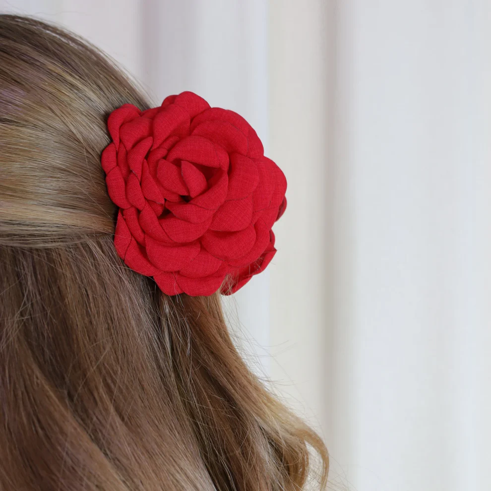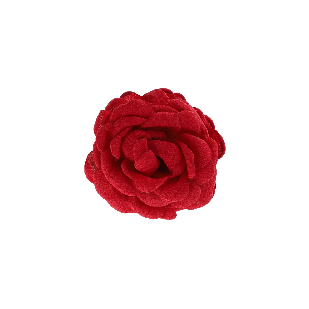 Daisy er en feminin og iøjnefaldende hårklemme udformet som en klassisk rose i dyb rød. Rosens smukke kronblade er lavet i blødt polyesterstof, der giver et elegant og naturligt udtryk, mens den robuste klemme i plast sikrer et godt greb i håret.