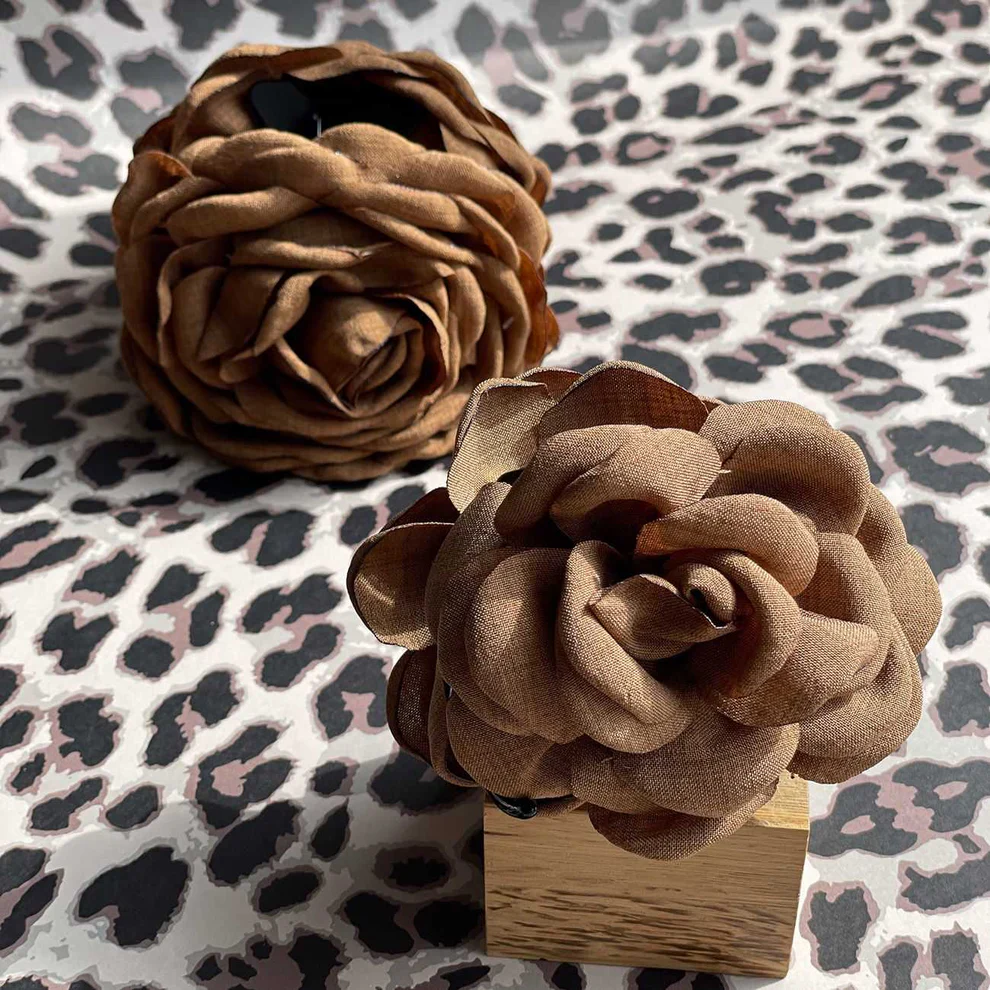 En romantisk hårklemme formet som en lille rose i mørkebrun polyester. Den bløde tekstur og naturtro udformning giver et elegant og feminint udtryk, mens klemmen sikrer et solidt greb i håret. Perfekt som blikfang i både hverdagsfrisurer og til særlige lejligheder.