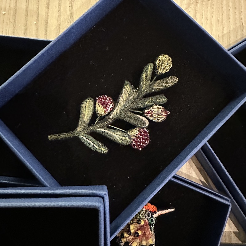 Trovelore håndbroderede brocher er lavet af de fineste kvaliteter og kun efter ordre for på den måde at undgå overproduktion. Det ældgamle håndværk er ved at forsvinde og derfor støtter Trovelore lokale kvinder i Indien, hvor denne fine form for smykker stadig laves - Kvaliteten er uovertruffen og hver broche har de fineste detaljer af tråd, palietter og perler. Alt er skabt i hånden med sans for detaljerne og det gamle håndværk. Når du køber en Trovelore broche køber du også et lille fint stykke kunst.