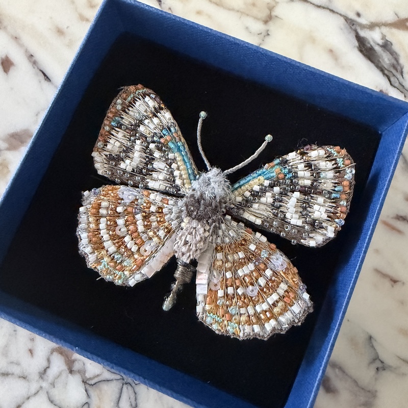 Trovelore håndbroderede brocher er lavet af de fineste kvaliteter og kun efter ordre for på den måde at undgå overproduktion. Det ældgamle håndværk er ved at forsvinde og derfor støtter Trovelore lokale kvinder i Indien, hvor denne fine form for smykker stadig laves - Kvaliteten er uovertruffen og hver broche har de fineste detaljer af tråd, palietter og perler. Alt er skabt i hånden med sans for detaljerne og det gamle håndværk. Når du køber en Trovelore broche køber du også et lille fint stykke kunst.