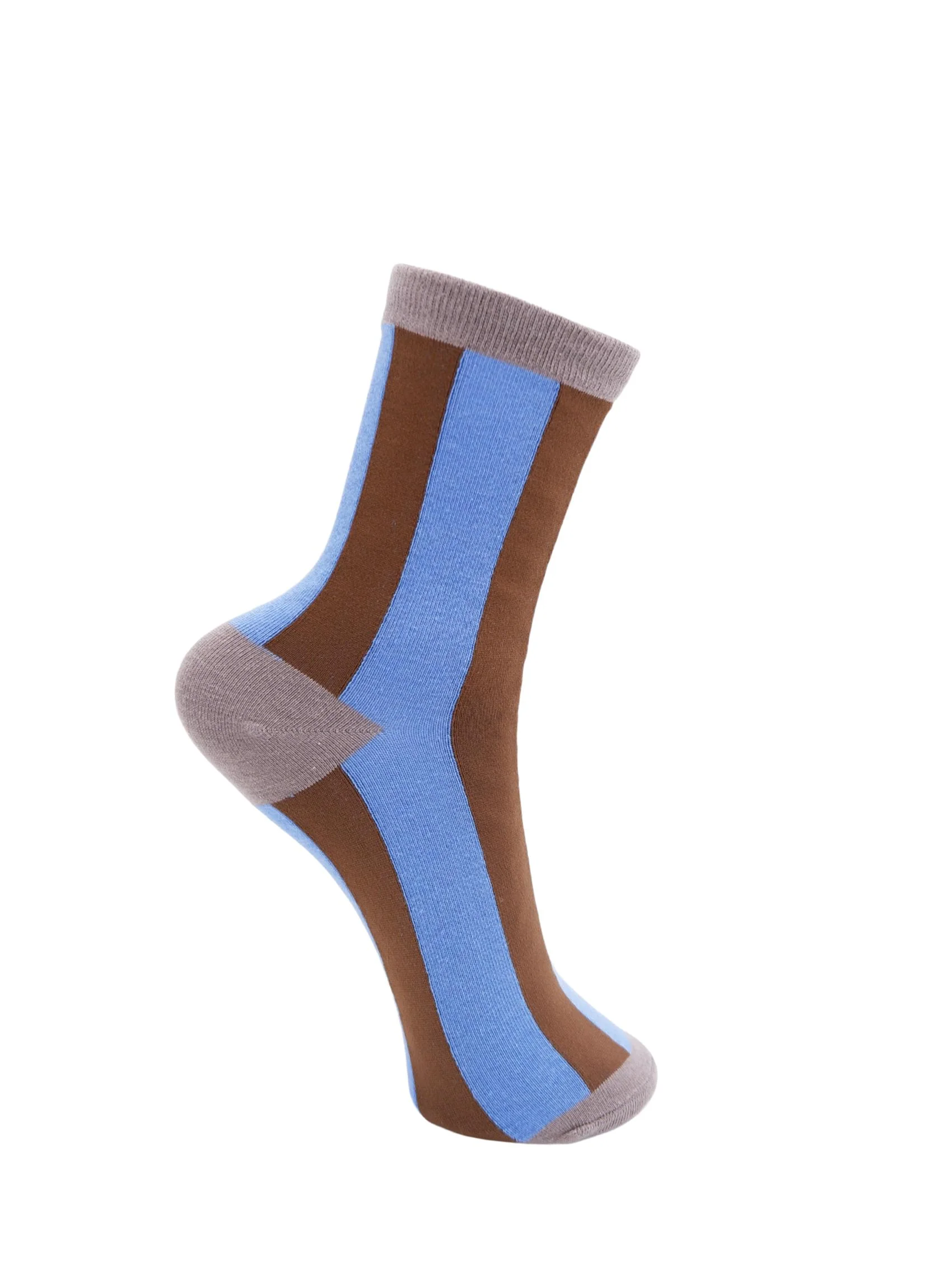 Et par sjove og iøjnefaldende strømper med asymmetrisk design – hver strømpe har sit eget mønster med striber i hver sin retning. Den blå og brune farvekombination giver et legende og unikt udtryk, der skiller sig ud i hverdagen. Bløde, behagelige og fleksible i pasformen.