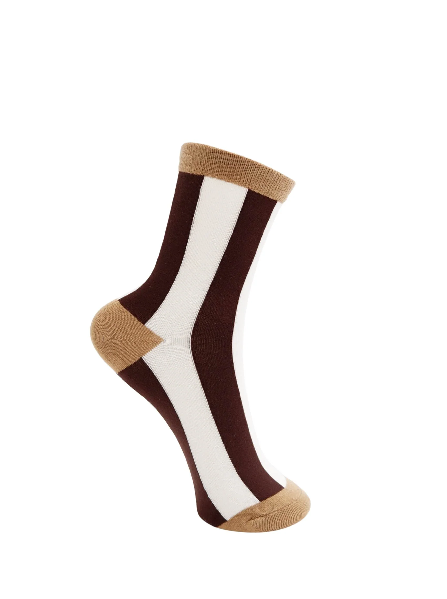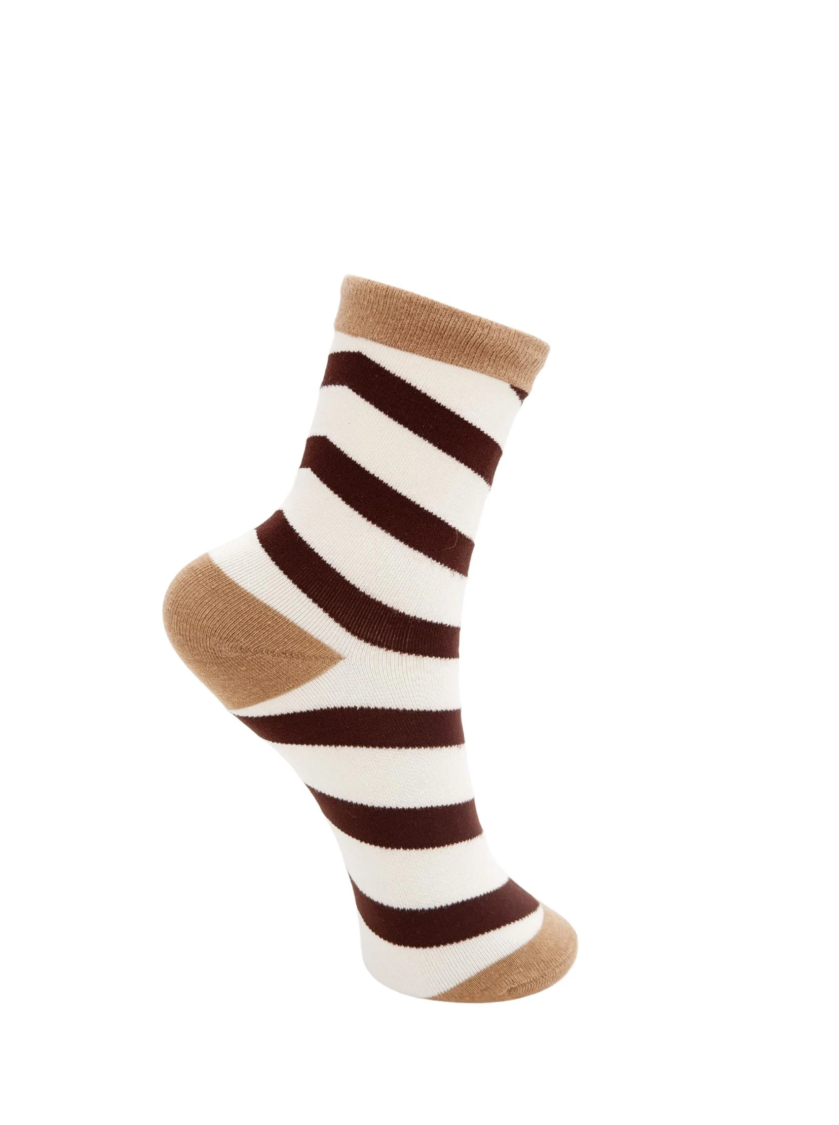 Et par sjove og iøjnefaldende strømper med asymmetrisk design – hver strømpe har sit eget mønster med striber i hver sin retning. Den creme og brune farvekombination giver et legende og unikt udtryk, der skiller sig ud i hverdagen. Bløde, behagelige og fleksible i pasformen.