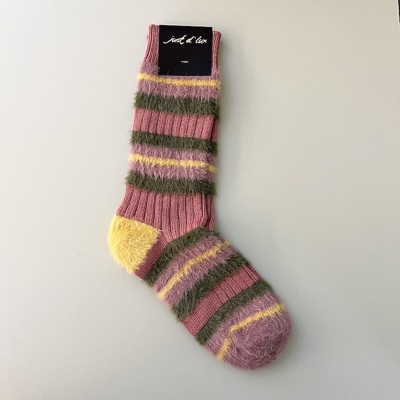 Virkelig fine og superbløde sokker i en vamset, fluffy kvalitet. Sokkerne har brede striber i rosa, grøn og gul, som giver et varmt og farverigt look.