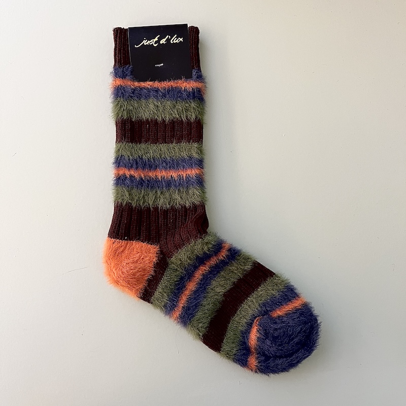 Virkelig fine og superbløde sokker i en lækker, fluffy kvalitet. Sokkerne har brede striber i brun, grøn, navy og orange, som giver et varmt, hyggeligt og efterårsagtigt look.