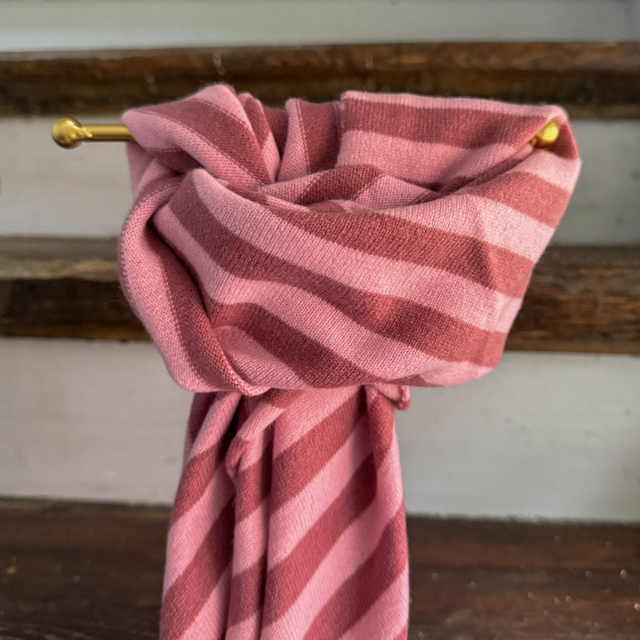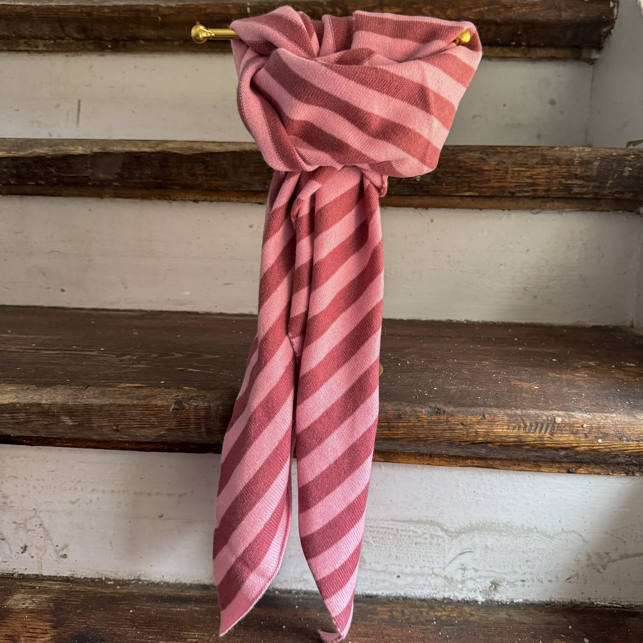 Blødt og let tørklæde i 100 % mongolsk cashmere med fine striber i rosa nuancer. Perfekt til både hverdag og rejser, da det nemt kan styles på mange måder – rundt om halsen, i håret eller som accessory på tasken. Et luksuriøst lille tørklæde, der gør en stor forskel.