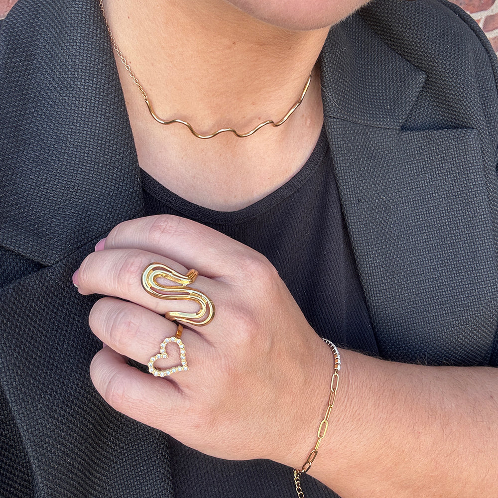 Tilføj et strejf af moderne elegance med Big Wavy Ring, en skulpturel ring med et organisk, bølgende design. Den bløde form og blanke overflade giver et eksklusivt og sofistikeret udtryk, som gør ringen perfekt til både hverdag og fest.