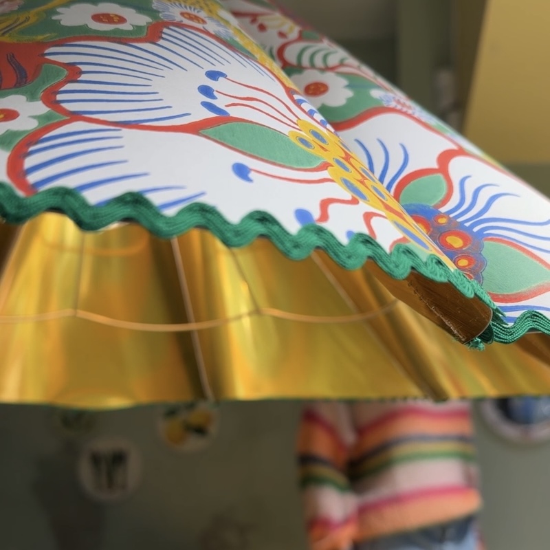 Lampen kommer med alt inklusiv - Indersiden er guldfarvet og stativet er et gammelt stativ, der er renoveret og malet i guld - Fatningen er vintage for at passe på det gamle stativ. Kommer med snoet guldfarvet stofledning. Skærmen kan også monteres på stativ til bordlampe, hvis man på et tidspunkt ønsker det.