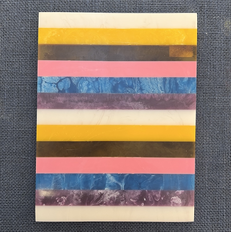 Dette farverige skærebræt er lavet i et smukt miks af lilla, blå, rosa, gule og hvide nuancer, der tilsammen skaber et moderne og kunstnerisk udtryk. De dekorative striber giver brættet et levende og karakterfuldt look, som gør det oplagt både som praktisk redskab i køkkenet og som dekorativ serveringsplanke.